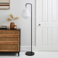 Featuring a curved stem, this stunning Churchgate Allexton Glass Floor Lamp has a striking black base for a stylish appearance, paired with a gorgeous clear flutted ribbed glass shade for a feminine touch. This floor lamp is complete with a 1.5m cable foot switch, making it easy to turn on and off. Pair this floor lamp with matching family pieces from the Churchgate Allexton range for a coordinated look.