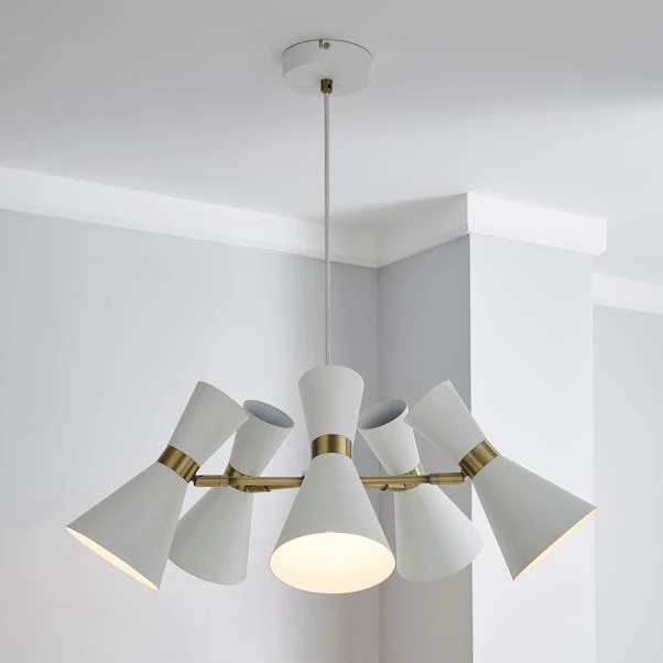 Bring a modern feel to your space with the elegant Archie 5 Light Ceiling Fitting. Offering adjustable height, this stylish light fitting features retro styled shades finished in a stunning matte white colourway, complete with a matching ceiling plate and complementing satin brass details.