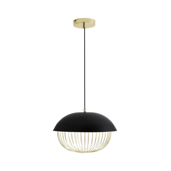 Bring a contemporary feel to your home with this modern Emzo Ceiling Fitting. Crafted with a stunning black painted shade, finished with a striking gold metal cage and a gold ceiling fitting. This stunning ceiling fitting is complete with a height adjustable black cable. This piece is dimmable with a suitable bulb and light switch. Matching Emzo family items are available to help coordinate your décor.