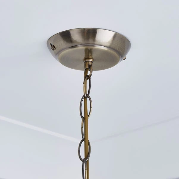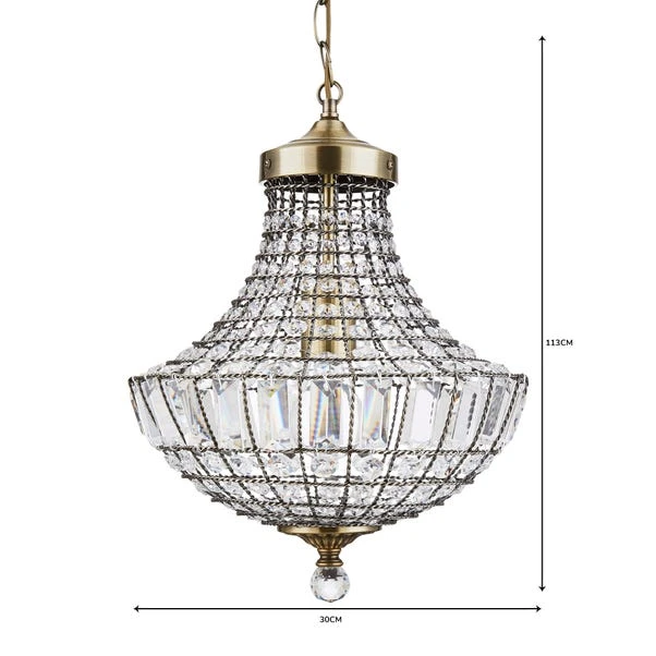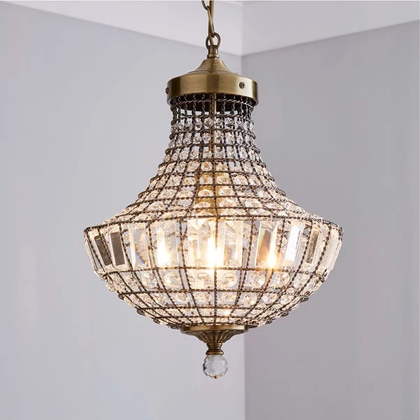 Featuring a metal chain design in an antique brass finish, this hanging ceiling fitting is decorated with intricately cut crystal glass embellishments. This light only requires 1 bulb. This piece is dimmable compatible, making it both an attractive and practical product.