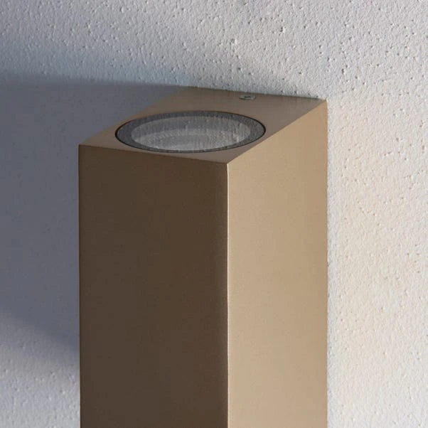 Featuring a modern and minimal design, the Lamont outdoor wall light is discreet and perfect for lighting up your outdoor spaces. Crafted from die cast aluminium alloy with a satin gold effect finish. The Lamont wall light has an IP44 rating, perfect for keeping your porch or patio lit through all seasons and available in a choice of stylish textured black and matt grey finishes.