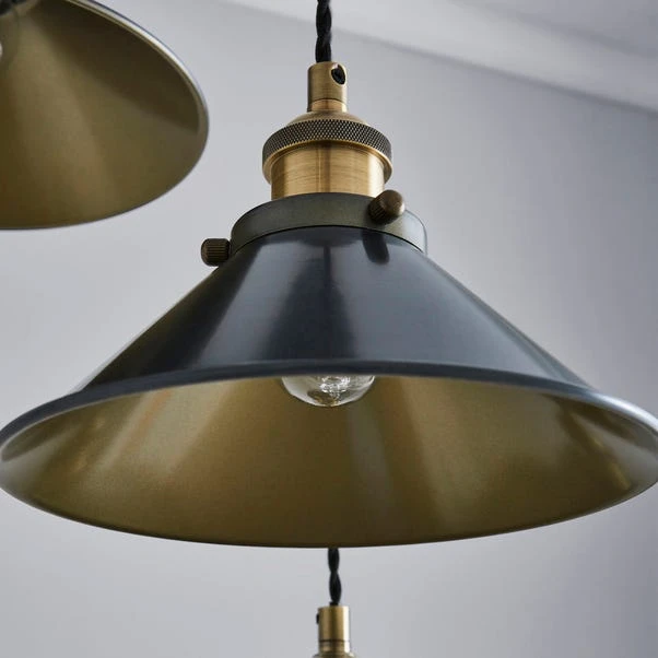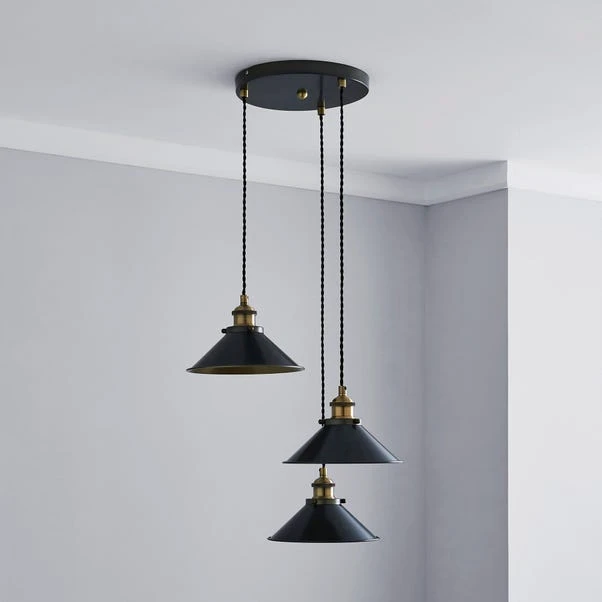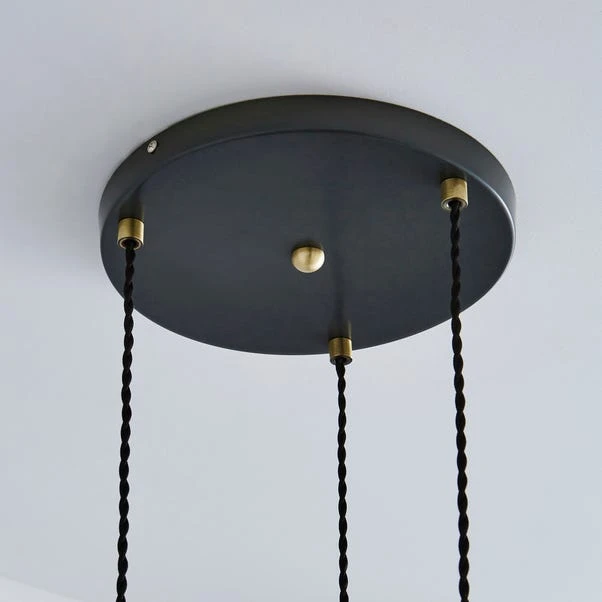Add this 3 light cluster fitting to your home for a modern, industrial feel. It features a dark, nickel colourway with a antique brass detail and black fabric flex cables.