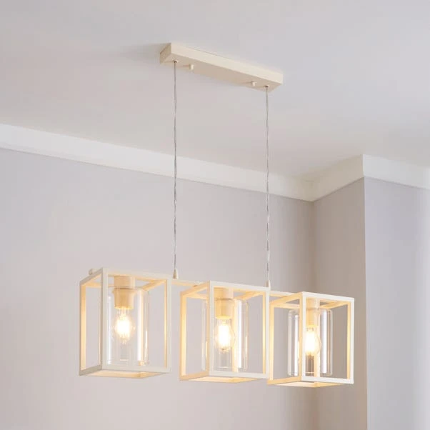 Bring a contemporary element to your home décor with the stunning adjustable London Ivory 3 Light Fitting. Crafted with a metal frame, clear glass shades and finished with ivory paint, this light fitting is the perfect way to enhance your décor with a modern and rustic touch. This piece is dimmable compatible, making it both an attractive and practical product.