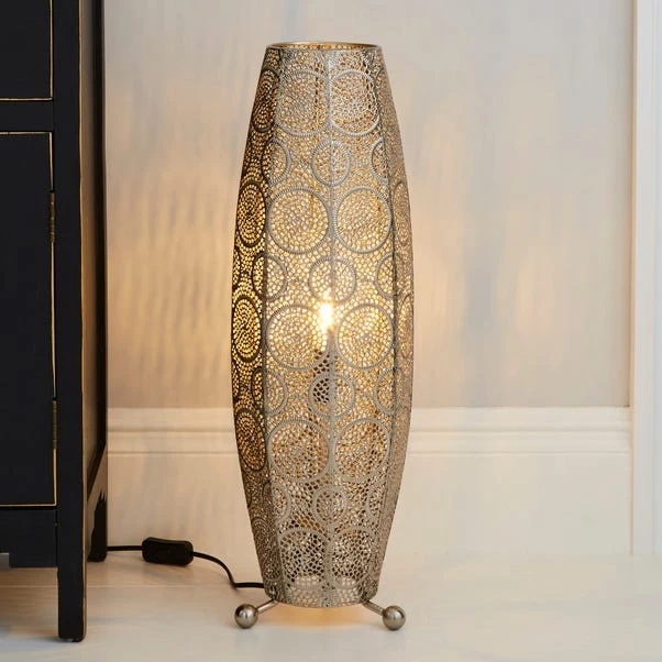 Crafted with a rich chrome finish, this unique Moroccan inspired mid-size floor lamp features a detailed cut out pattern in a striking design.