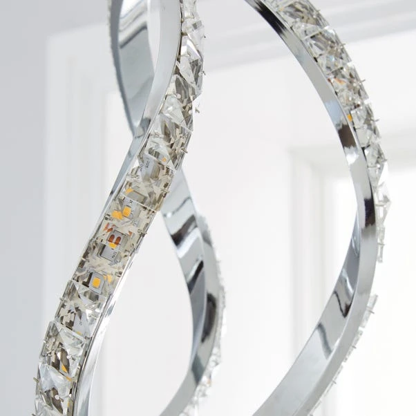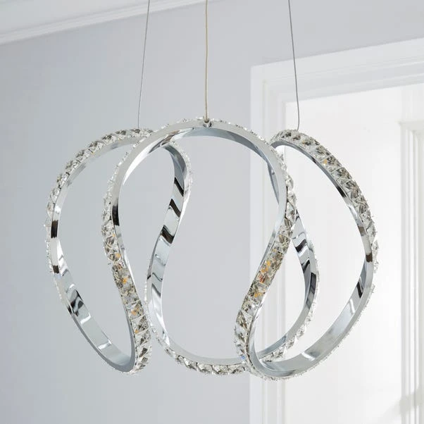 With its unique curved design, the striking Marsia light fitting is ideal for adding a touch of contemporary class to your décor. Complete with integrated LED strips and adjustable in height, this stunning light fitting features glass jewel encrusted metal arms, a gorgeous chrome finish. Please note this piece is not dimmable compatible.