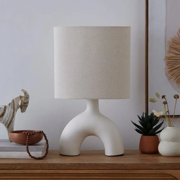 Modern and funky, our Noah Arc Table Lamp has been crafted with a faux linen shade in a natural colourway to suit any home interior decors. The Artizan design allows your home to look stylish and sleek with the textured ceramic base in an arc shape. Available in 2 sizes for any tabletop space.