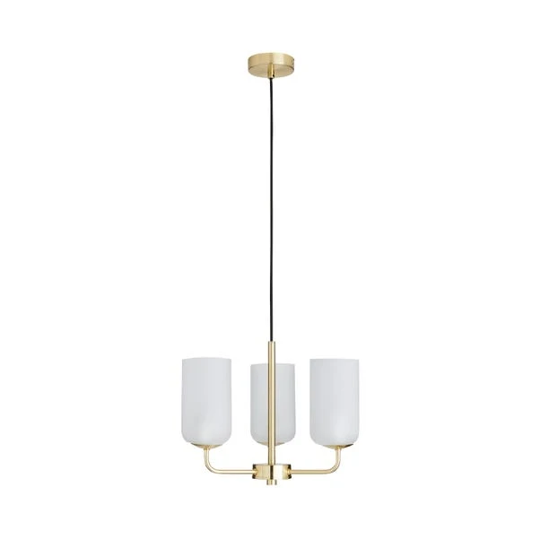 The Palazzo 3 Light Chandelier is perfect for adding a modern, decorative touch to any space. This stunning ceiling fitting features a stunning gold effect finish, chic frosted glass shades, and a complementing black fabric flex with adjustable height. This piece is dimmable compatible, making it both an attractive and practical light fitting.