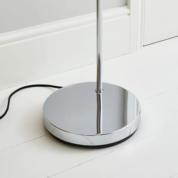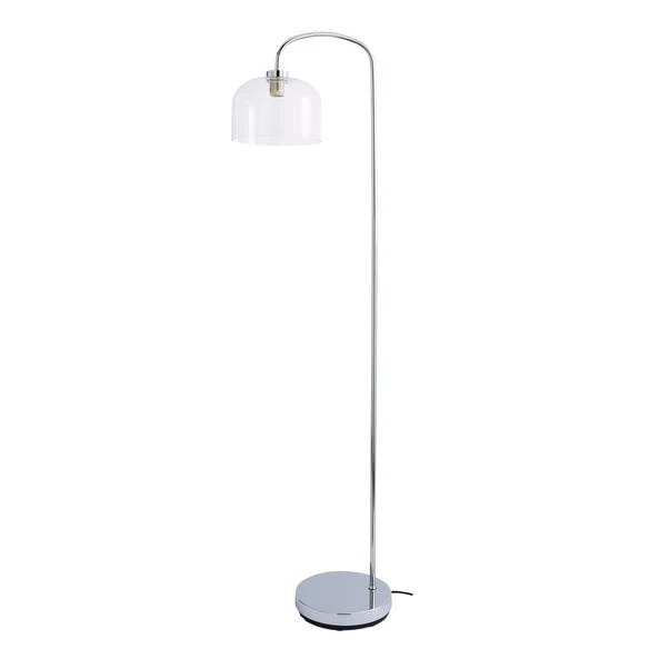 The Palazzo Floor Lamp is perfect for adding a modern, decorative touch to any space. This stunning lamp features a stunning chrome finish, a chic dome clear glass shade paired with a curved stem and a complementing black fabric cable with an inline foot switch. This floor lamp will make a timeless addition to any home, with matching family items available to help coordinate your home.
