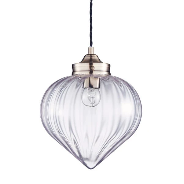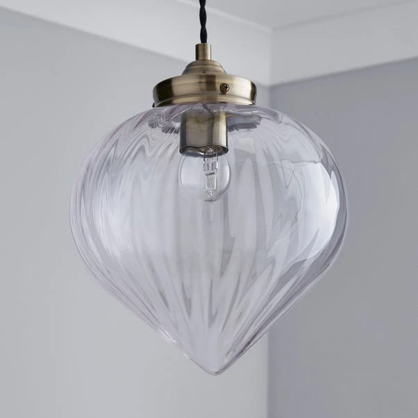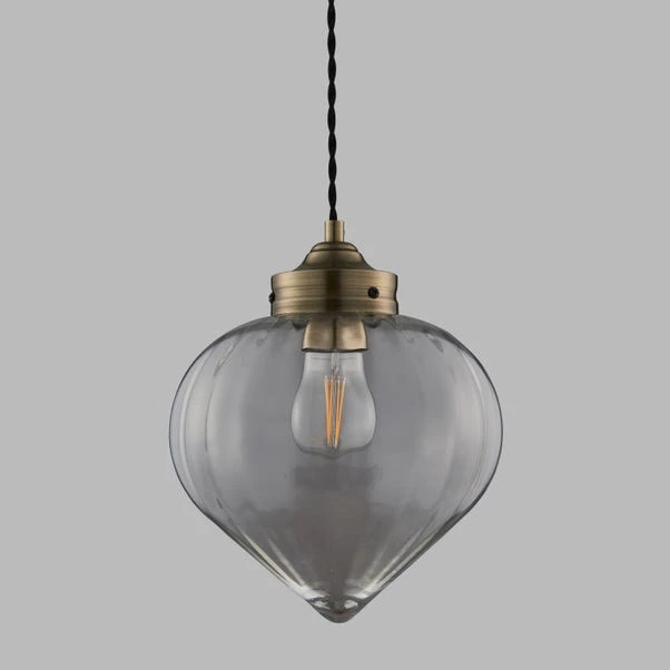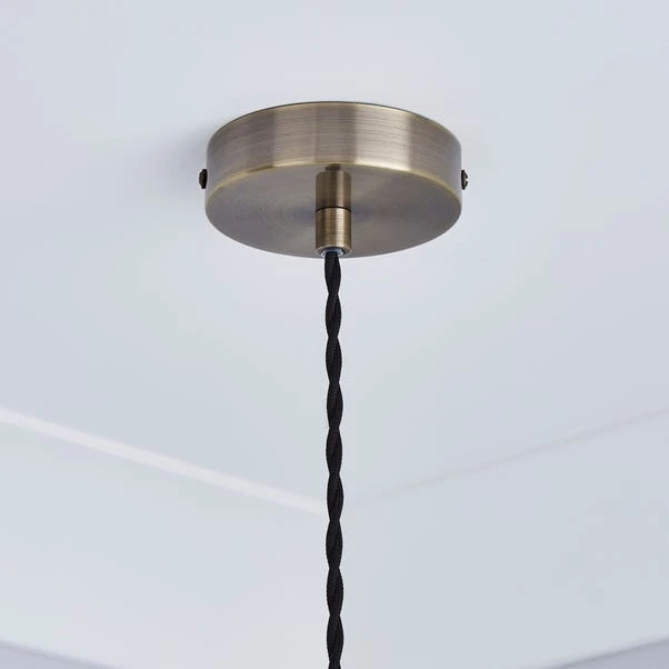 Featuring a shaped glass shade, this dimmable light fitting hangs from a twisted flex and is finished with an antique brass effect plate.