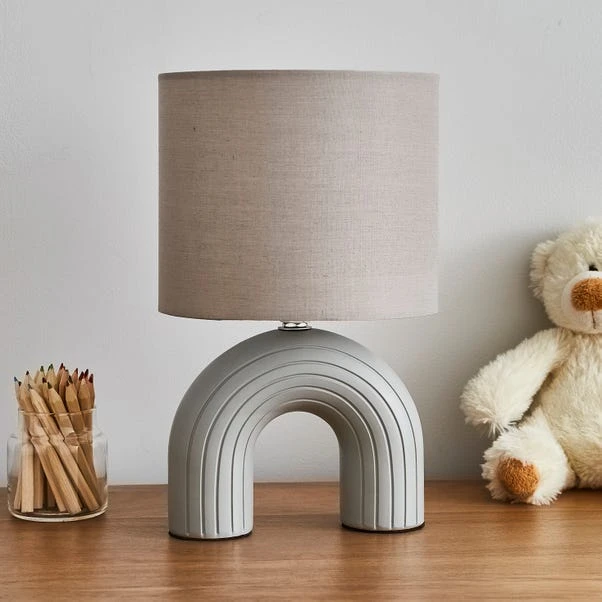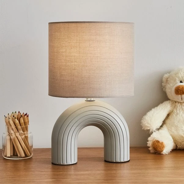 Add a fun touch to your kids bedroom with the Rumey Integrated LED Table Lamp. Designed with a cool rainbow shaped resin base with a smooth matt finish, complete with a drum shade made from polycotton. This contemporary design lamp is available in a choice of three beautiful shades to suit your kids bedroom décor.