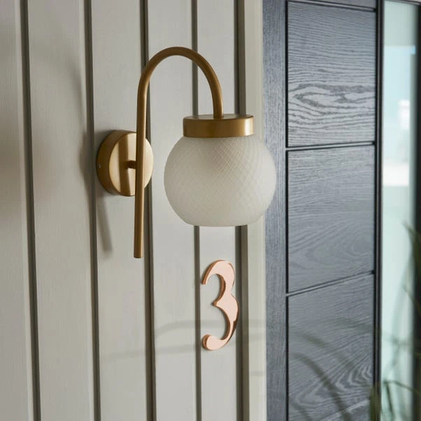Boasting a beautiful mdoern retro styling, the Ruthy wall light would add a classy touch to any outdoor space. this wall light is finished in a satin gold colour, and paired with a textured, frosted glass shade and features an IP44 rating.