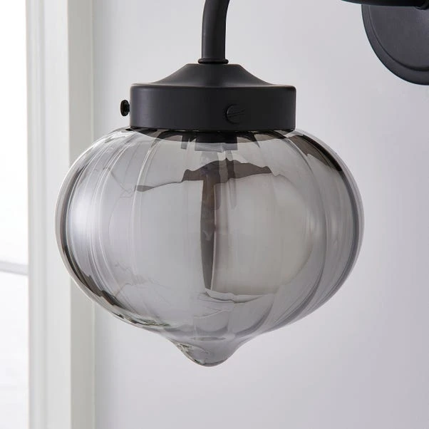 With a gorgeous timeless design, the Voyager smoked wall light would make a stunning statement piece for any indoor space. Styled with a curved arm and fittings finished in a choice of matte black or brass, this light is characterised by its beautifully shaped, ribbed glass shade. Matching family items are available to help coordinate your home. This wall light is dimmable compatible with a suitable bulb and light switch.