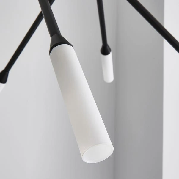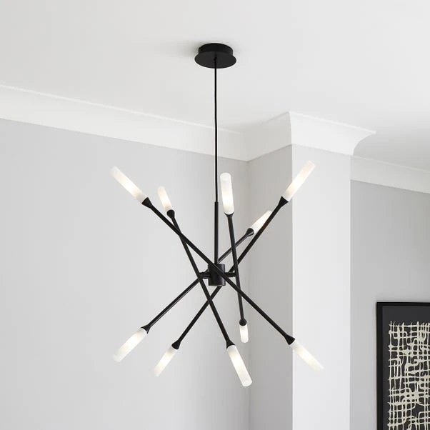 The Elements Fontain 10 Light Ceiling Fitting features an impressive modern contemporary design with a steel matt black paint effect base paired with double sided matt white glass tube shades. This unique piece is height adjustable, dimmable and impressive in size, perfect for complementing a range of contemporary home décors. Matching family items are available to help coordinate your space.