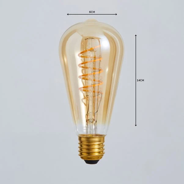 Made with clear glass, complete with a fun spiral filament, this highly efficient 4 watt LED filament bulb features an edison screw cap fitting and lasts up to 15,000 hours, providing instant warm white light at the flick of a switch.