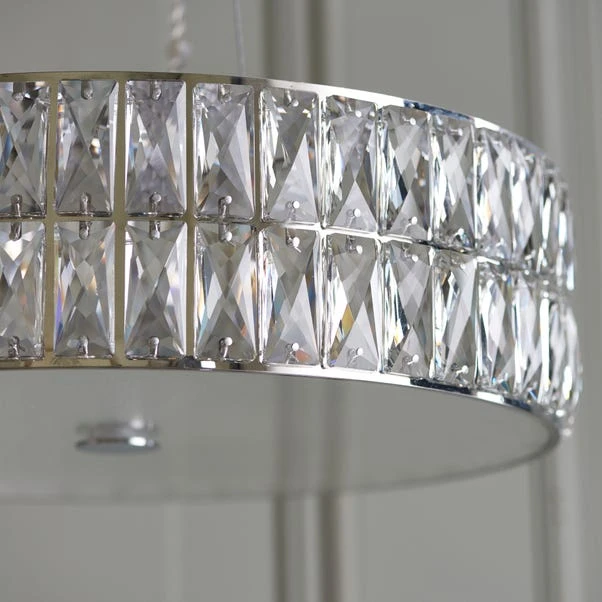 High quality clear crystals adorn this deluxe chrome plated LED contemporary pendant, fully enclosed by a beautiful prismatic glass diffuser. The combination of clear crystals, polished chrome and glass create a luxurious interior decorative light pendant. Suspended from thin wire and clear flex with integrated LED light source for bright light output.