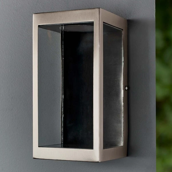 The perfect way to add a contemporary element to the exterior of your home with the Hearne Outdoor Wall Light, constructed from sleek and stylish stainless-steel and fitted with clear glass panels for ultimate transparency and clarity. This fresh and modern piece of outdoor lighting has an IP44 rating for outdoor suitability, is designed with a solid and clean structure and completed with a brushed finish.
