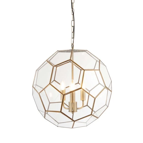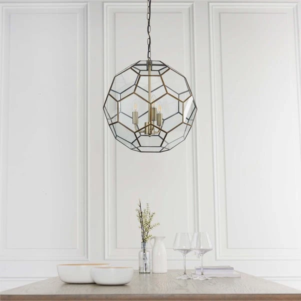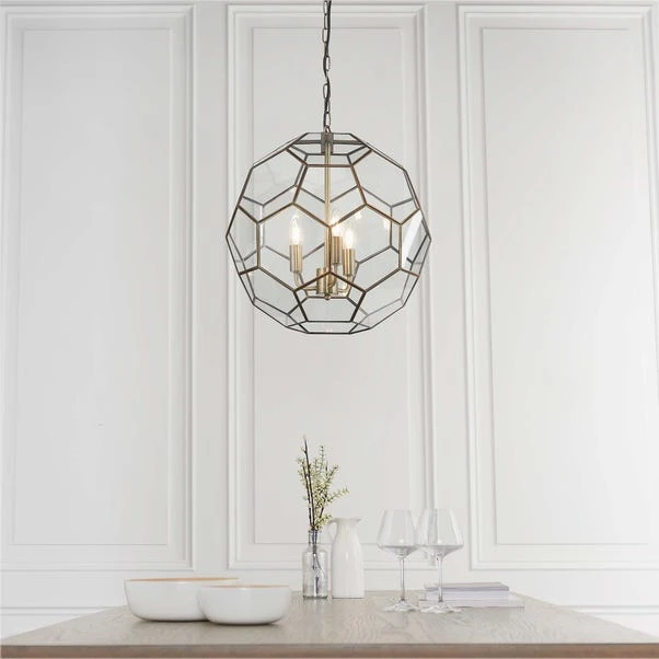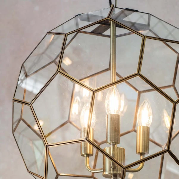 Featuring a striking hexagonal design, the Vogue Hillier 3 Light pendant edged in a stunning antique brass will bring a modern and contemporary feel to your home. This design is suspended from a decorative adjustable chain, it has a dimmable feature and suitable for use with LED lamps.