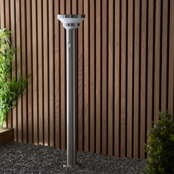 Light up your walkway or garden path with the Leif 80cm Outdoor Solar PIR Floor Light for a sleek, clean and modern style. This modern bollard style lighting comes complete with a built in PIR and Photocell sensor as well as solar powered functionality and a IP44 rating to ensure outdoor suitability. The brushed stainless-steel construction offers a fresh and smooth look and can be combined with other items of outdoor lighting in the Leif range for a synchronised and coordinated look.